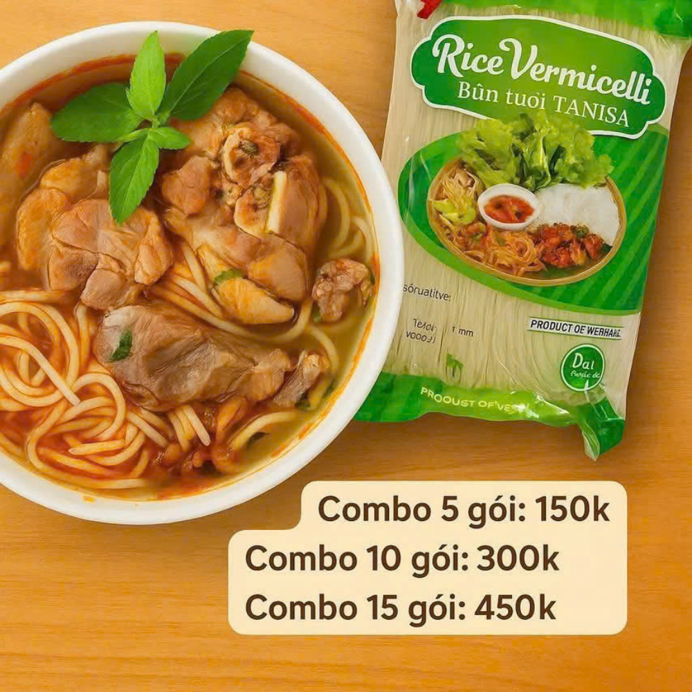 Với những sợi bún trắng ngần, dai ngon và thoảng mùi thơm tự nhiên của gạo, bún gạo Tanisa là nguyên liệu tuyệt vời cho vô vàn món ăn truyền thống Việt Nam. Bạn có thể dùng làm bún tươi ăn kèm với những món ăn đậm đà hương vị như chả giò giòn rụm, thịt nướng thơm lừng, hay các món gỏi thanh mát như bì cuốn, gỏi cuốn. Ngoài ra, bún Tanisa cũng là lựa chọn hoàn hảo cho các món nước quen thuộc như bún nước lèo hay các món lẩu hấp dẫn như lẩu tôm càng, mang đến những bữa ăn tròn vị, đậm đà hương quê.